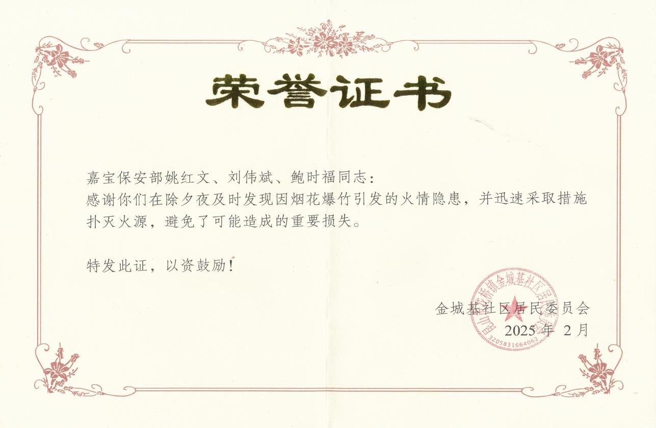 2025年新春长假刚过,2月7日昆山市大金盾保安服务有限公司收到昆山市花桥金城基社区居民委员会颁发的荣誉证书,感谢我公司驻小区保安队员除夕夜及时发现因燃放烟花爆竹引发的火情隐患,并迅速组织力量采取有效措施扑灭火源,避免了可能会造成的损失。