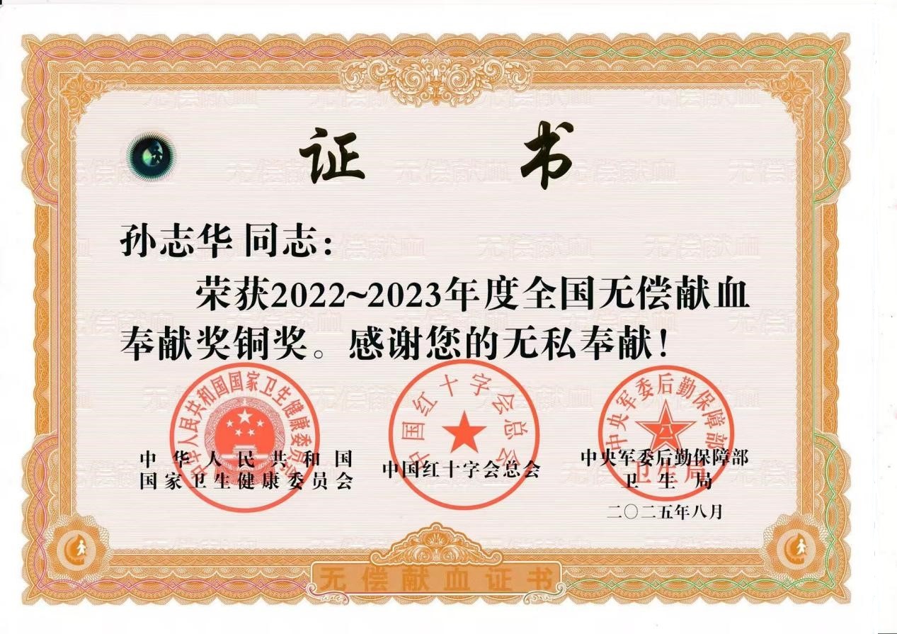 —— 保安员孙志华荣获全国无偿献血奉献奖铜奖 —— 2026-02-06 点击数:131